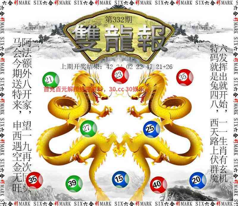 | 332期:金龙报【开:龙26】 二六倒合开三八,金木特号回头来 综合:龙牛猪猴鸡兔 |